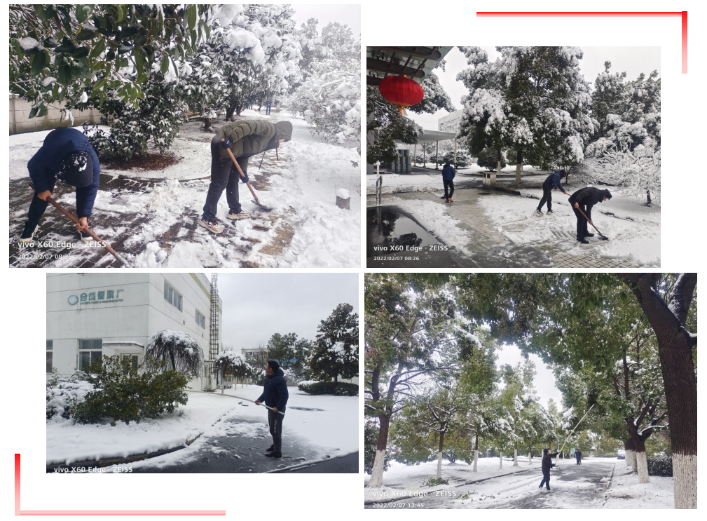 一聲號召,大家紛紛冒著雪拿著大掃帚和鐵鍬干得熱火朝天,對廠區(qū)內(nèi)的主要道路和辦公樓及工廠門前的積雪、冰凍進行鏟除。大家一邊鏟著雪,一邊提醒上班的員工注意腳下安全。緊接著大家發(fā)現(xiàn)很多樹枝被積雪壓斷或壓彎存在安全隱患,同志們立即拿來長竹桿把被壓彎的樹干上積雪徹底清理掉,確保廠區(qū)出行道路安全通暢,員工出入安全。